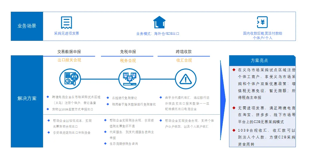 在义乌市场采购试点区域注册个体工商户,享受义乌市场采购和个体户双重优惠政策:增值税无票免征,暂无限额;所得税自主申报 无需进项发票,满足跨境电商在淘宝、拼多多、线下市场等平台上的C2B无票采购模式 1039合规收汇,收汇款可以到法人个人款,方便C2B采购资金周转